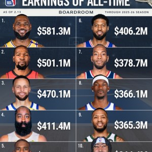 NBA 历史生涯总薪资排行榜(数据截至2026年2月13日,涵盖2025-26赛季)1.詹姆斯 5.813 亿美元2.杜...
