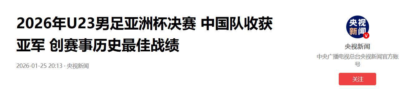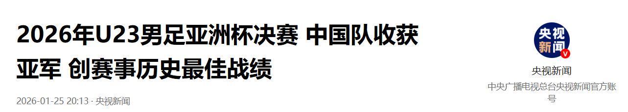 央视新闻:2026年U23男足亚洲杯决赛 中国队收获亚军 创赛事历史最佳战绩