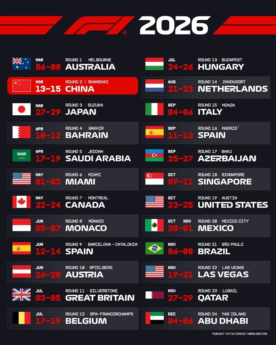 F1在2026赛季共设24场分站赛,从3月持续至12月,中国站是F1在全球范围的第二站比赛。