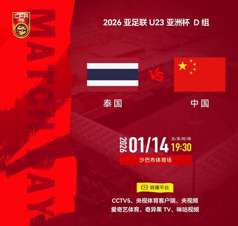北京时间1月14日晚19:30,沙特U23亚洲杯小组赛末轮,U23泰国队VS中国U23!中国队只要打平就出线,仍要全力争胜。央视体育频道CCTV5、央视体育客户端、央视频、爱奇艺体育、奇异果TV、咪咕视频进行直播!泰国U23前两场1负1平,暂时小组排名垫底,但U23国足不可轻敌。